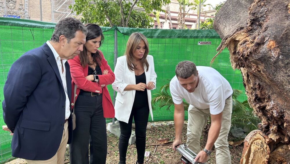 El Ayuntamiento de Sevilla ha iniciado los trabajos de inspección del cuello del tronco del ficus de la Encarnación. En este sentido, la delegada de Parques y Jardines, Evelia Rincón, ha explicado que "junto a la reducción de la copa para estabilizar el ejemplar, hemos comenzado a usar dos sistemas de última tecnología y alta precisión que nos van a indicar la densidad de la madera para poder tomar decisiones futuras sobre el propio árbol. Queremos conocer cuál es el alcance de la pudrición que se ha hecho evidente con la fractura del eje que se produjo el domingo pasado".