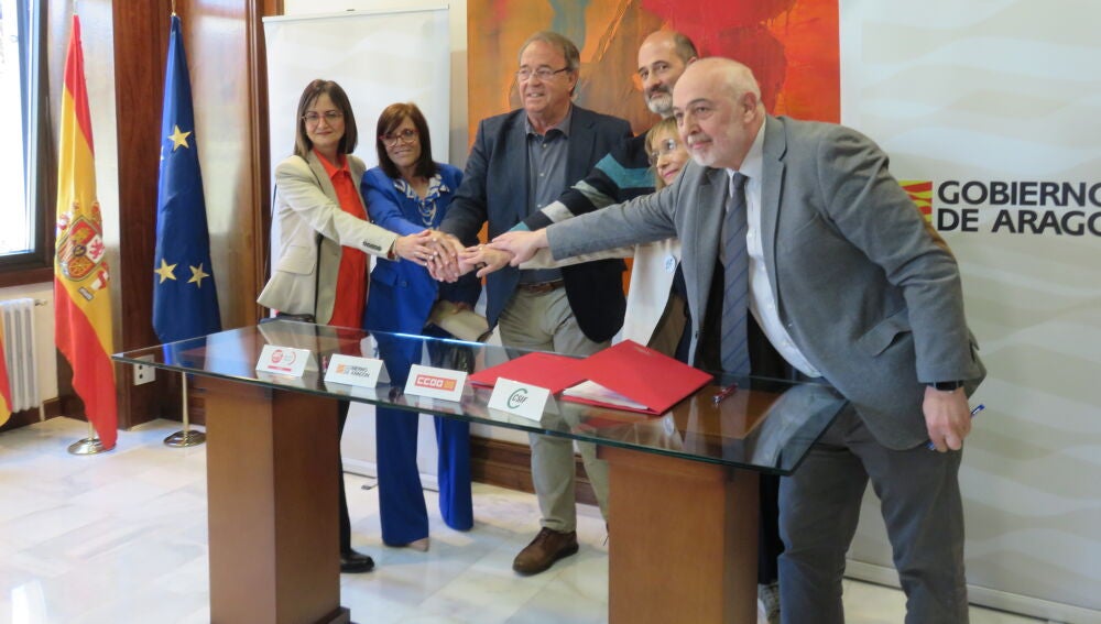 El Gobierno aragonés y los sindicatos han firmado un nuevo convenio colectivo para los casi 12.000 trabajadores de la Administración General de la Comunidad Autónoma. El convenio anterior, de 2006, llevaba 14 años caducado y no recogía avances ya pactados, como el teletrabajo. El nuevo documento reduce la jornada ordinaria a 35 horas semanales y favorece la conciliación y la igualdad de género. Establece, por ejemplo, un “complemento de igualdad retributiva”, para elevar los salarios de limpieza y educación infantil, las categorías más feminizadas y peor remuneradas.