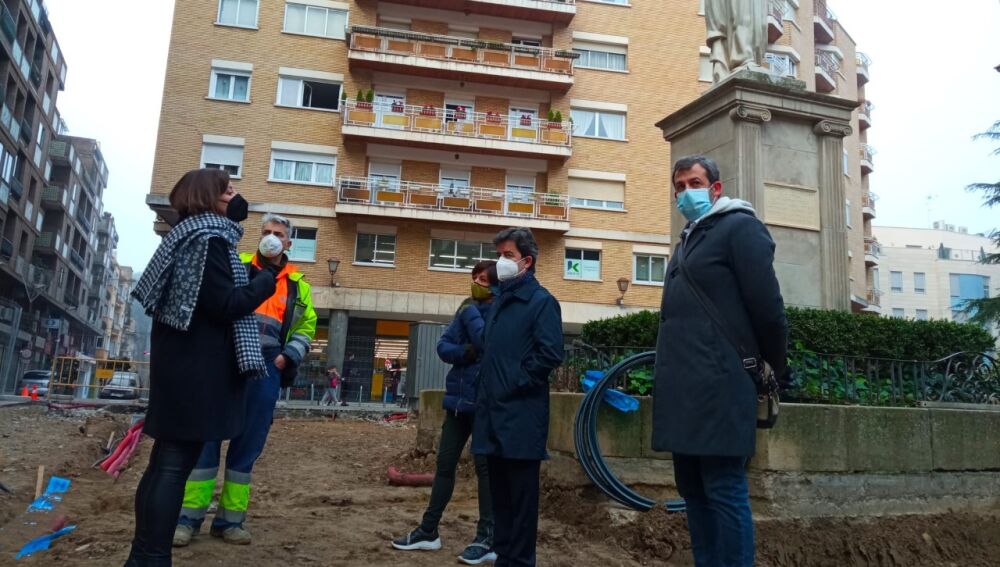 Avanzan a buen ritmo las obras en la plaza Inmaculada que este jueves ha visitado el alcalde de Huesca, Luis Felipe, acompañado por los concejales de Urbanismo y Servicios Generales, María Rodrigo y Roberto Cacho, respectivamente. Por el momento, ya se ha demolido el pavimento y la solera de la plaza, y se está trabajando en la instalación de riego y alumbrado público. El siguiente paso será colocar un nuevo pavimento que eliminará las barreras arquitectónicas existentes ya que será una plataforma única.