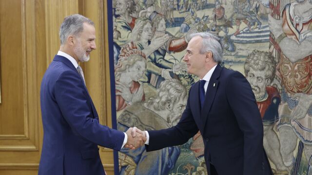 El rey Felipe VI ha recibido hoy al presidente del Ejecutivo aragonés, Jorge Azcón, en el Palacio de la Zarzuela. Un encuentro incluido dentro de la ronda de contactos que el monarca está manteniendo con los dirigentes autonómicos que fueron elegidos en las elecciones del 28 de mayo. Azcón y el monarca han hablado sobre economía, cultura y medio ambiente.