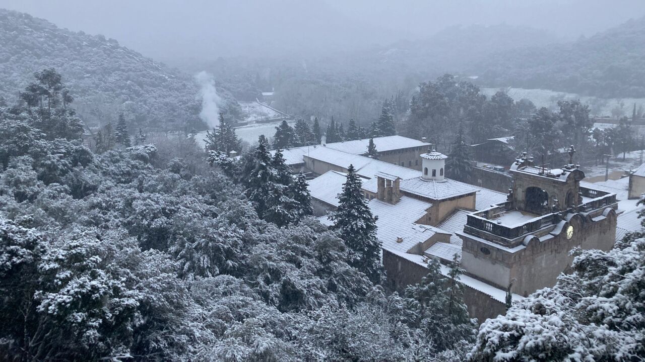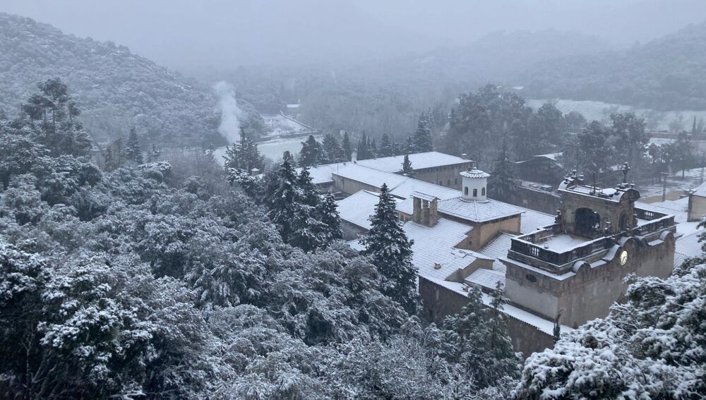 La nieve cubre de blanco el santuario de Lluc, en la Sierra de Tramuntana de Mallorca. | Bisbat de Mallorca.