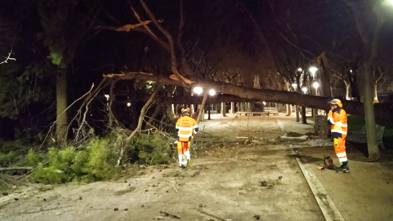 Bomberos y brigadas municipales han retirado esta mañana el pino caído el parque Miguel Servet. El ejemplar, de más de 20 metros de altura, ha cedido por la saturación del terreno tras las lluvias y las rachas de viento registradas esta noche, que han alcanzado los 51,5 kilómetros por hora. Según informan desde Medio ambiente, en zonas de pinar con ejemplares de gran altura y copas desarrolladas, este tipo de situaciones puede verse favorecido por desequilibrios puntuales y por el incremento de peso en la copa debido a la acumulación de agua.