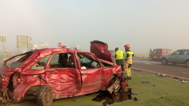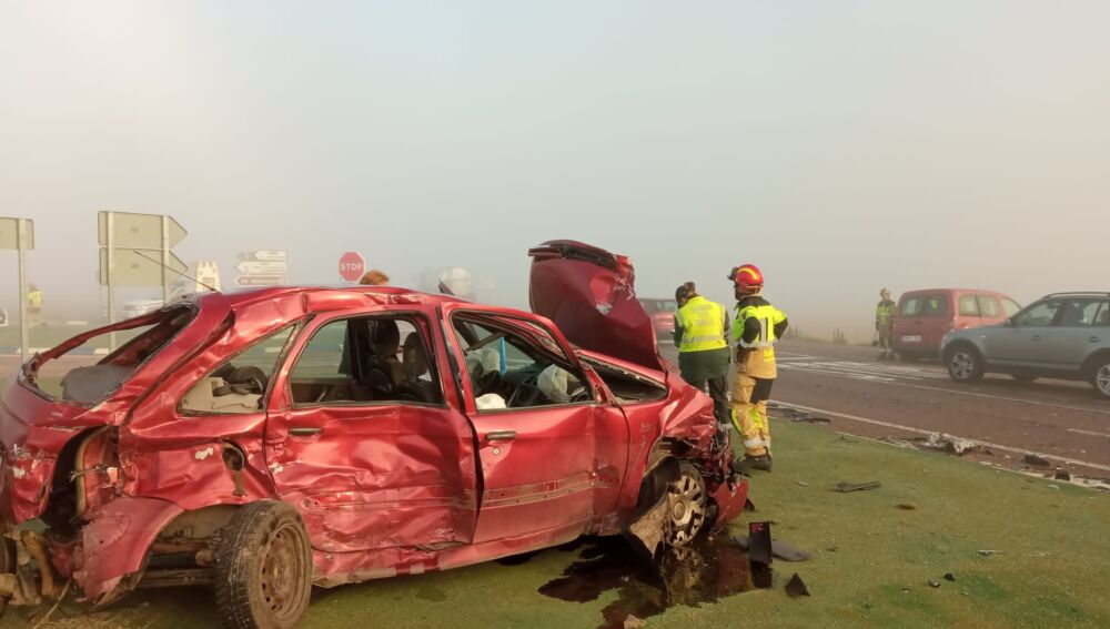El aviso del accidente se ha producido pasadas las 8:20 de la mañana y hasta el lugar se han desplazado un oficial, cuatro bomberos y dos vehículos del parque de Teruel. Al llegar al lugar del accidente han comprobado que había una abundante niebla que dificultaba la visión para los conductores.