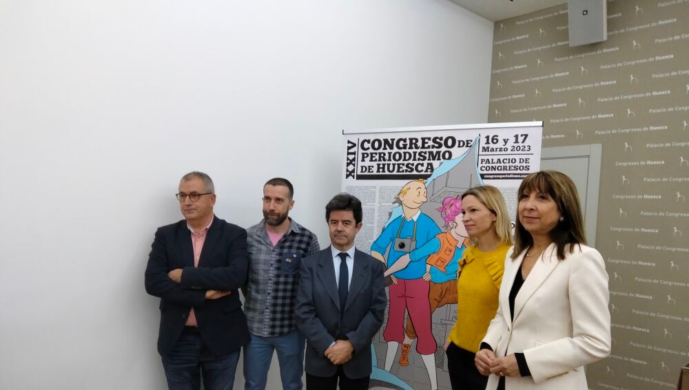 La presentación también ha servido para mostrar el cartel que hará de imagen del Congreso de Periodismo de Huesca 2023, en el que Peibols ha ilustrado al personaje de comic Tintín como un veterano periodista con libreta, boli y cámara y una compañera joven con móvil y iPad, ambos atravesando un papel de periódico como reflejo de que todos los profesionales del sector deben ir de la mano.