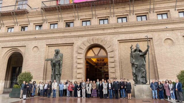 El consistorio de la capital también ha convocado un minuto de silencio tras los hechos acaecidos ayer. Las banderas ondean a media asta y se ha colocado en el balcón principal, en la Plaza del Pilar, una pancarta "Contra la violencia de géneroW. Representantes de todos los grupos políticos municipales han participado en esta concentración a la que también se ha sumado la Justicia de Aragón, Concepción Gimeno.