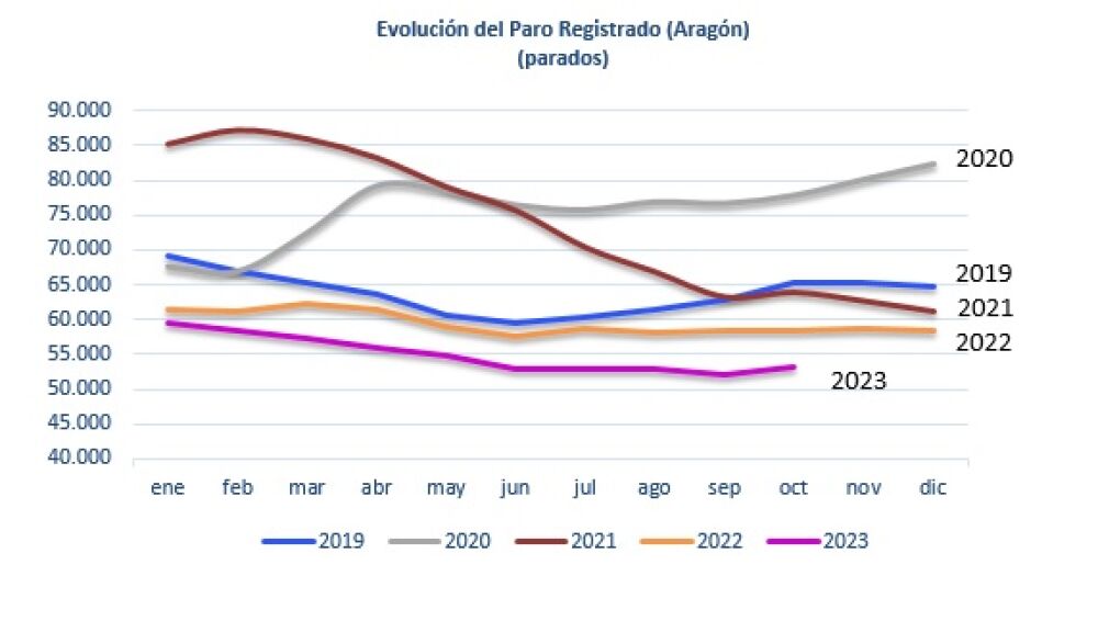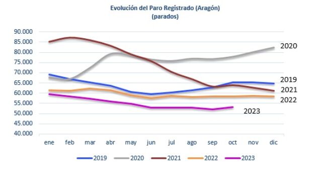 El paro registrado en Aragón se ha incrementado un 1,67% en octubre respecto al mes anterior, una subida habitual en este mes, al finalizar los contratos de la temporada estival. Solo en el año 2022 se produjo una leve disminución. Este último mes ha crecido el desempleo en las tres provincias, tanto en hombres como en mujeres, y en todos los sectores económicos, salvo la construcción.