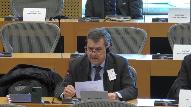El presidente de corREDores.eu, Salvador Galve, durante su intervención en la Comisión de Peticiones del Parlamento Europeo | Alianza CorREDoresEU