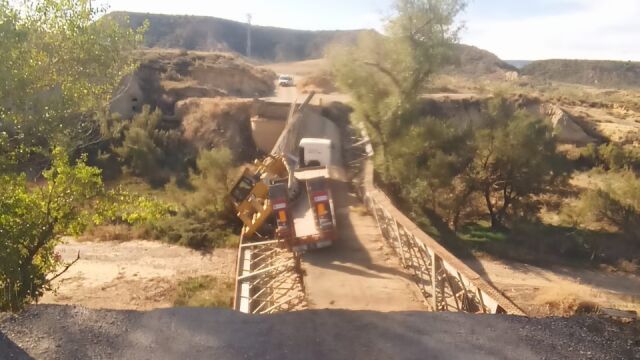 El puente de hierro sobre el río Alcanadre que une a las localidades de Villanueva de Sijena y Sena se ha desplomado esta mañana al paso de un camión que transportaba una retroexcavadora y que excedía el límite de tonelaje. Tal y como explicaba el director general de Carreteras, Bizén Fuster, el límite de carga era de 40 toneladas mientras que el peso de los dos vehículos superaba las 57.