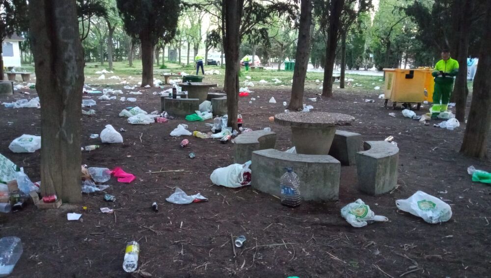 Durante toda la tarde y la noche de ayer cientos de jóvenes universitarios se congregaron en el pinar y en las inmediaciones de la ermita de Salas para celebrar la fiesta de primavera de Empresariales. Esta mañana el espectáculo era dantesco, los operarios de limpieza de Grhusa se han encontrado con cientos de kilos de basura, principalmente, bolsas, vasos, botellas y otros envases de plástico, así como latas, botellas de cristal y orines en este espacio natural de los alrededores de Huesca muy frecuentado por caminantes, deportistas y familias. La fiesta se concentró en los alrededores de la ermita pero de madrugada se trasladó a la zona del Tubo de modo que en su camino los estudiantes fueron extendiendo el reguero de basura a otras calles de la capital oscense como la Avenida de los Danzantes, Obispo Pintado o San Lorenzo.