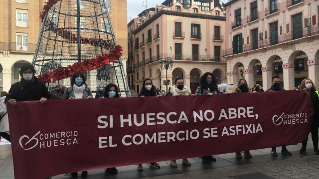 Nuevo SOS del comercio. El sector ha protagonizado esta mañana una protesta que ha partido de la plaza López Alllué y que estaba convocada por la Asociación de Empresarios de Comercio de Huesca, aunque en la misma también han participado distintos hosteleros de la ciudad. La presidenta de la Asociación de Comerciantes de Huesca, Susana Lacostena, ha insistido en la necesidad de levantar el confinamiento perimetral de Huesca, modificar los horarios, para permitir el cierre de nuevo a las 20 horas los fines de semana y ampliar los aforos todavía al 25%.