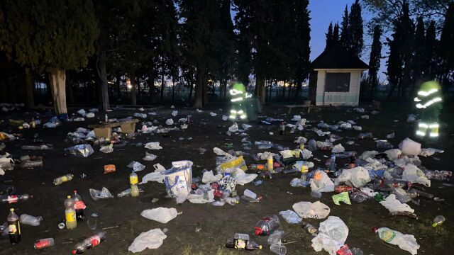 Las brigadas del Ayuntamiento de Huesca han tenido que emplearse hoy a fondo para limpiar el entorno de la ermita de Salas, en el que, anoche, se celebró una multitudinaria fiesta universitaria.