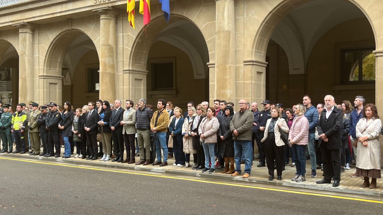 Todas las instituciones de la provincia de Huesca se han sumado al luto por la tragedia y las afecciones que ha causado la DANA principalmente en las comunidades de Castilla La Mancha y Valencia. Las banderas de los edificios oficiales de la capital oscense ondean todas a media asta. Este jueves, a las puertas de la subdelegación del Gobierno en Huesca, se ha guardado de nuevo un minuto de silencio en memoria de las víctimas.