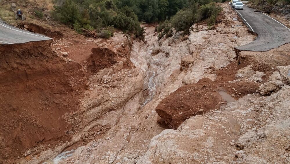 La tormenta caída la pasada noche dejó más de 100 litros por metro cuadrado en apenas una hora haciendo crecer los barrancos y ocasionando daños en dos puntos de la carretera autonómica. En un caso, se espera al menos abrir en las próximas horas un carril, en otro los trabajos de emergencia de prolongarán alrededor de tres meses.