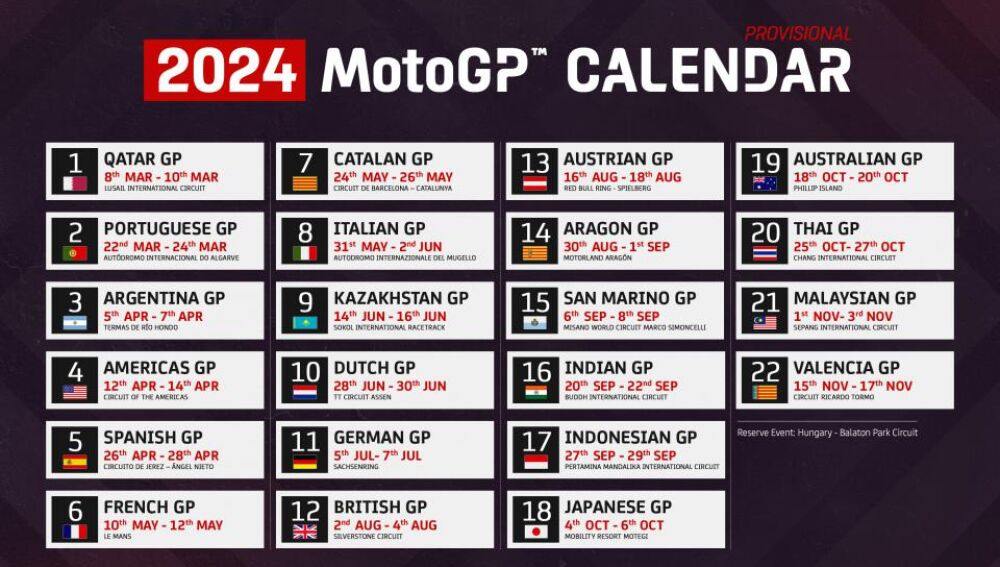 El Gran Premio de Aragón se celebrará del 30 de agosto al 1 de septiembre en el circuito de Motorland. El campeonato comenzará a principios de marzo en Qatar y terminará en el Circuito Ricardo Tormo de Cheste, pasando por 18 países distintos.