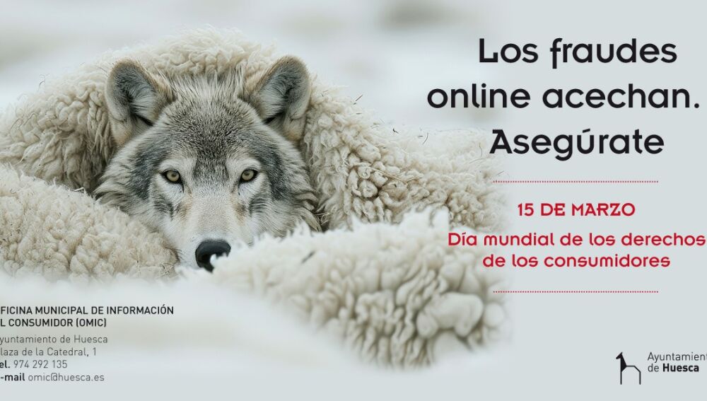 El 15 de marzo se celebra el Día Mundial de los Derechos de los Consumidores y, desde el Ayuntamiento de Huesca, la OMIC dedica este día a los jóvenes para concienciarles y hacerles reflexionar sobre la información que ven en internet y en las redes sociales. Y es que, desde la pandemia, los fraudes online se han disparado, de allí el lema elegido este año “Los fraudes online acechan… asegúrate” acompañado de un cartel que representa a un lobo con la piel de cordero.