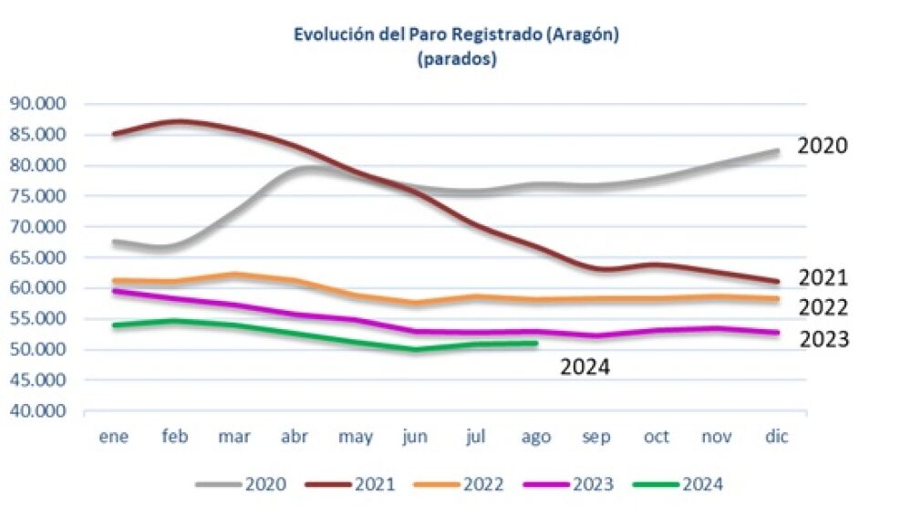 En Aragón, la afiliación media a la Seguridad Social en agosto disminuyó en 7.950 personas respecto a julio, un descenso del 1,27% mensual, con lo que la cifra de afiliados en alta se situó en 620.000 personas. Por comparación con el mismo mes del año anterior, la afiliación ha aumentado en 11.729 personas (1,93% anual).