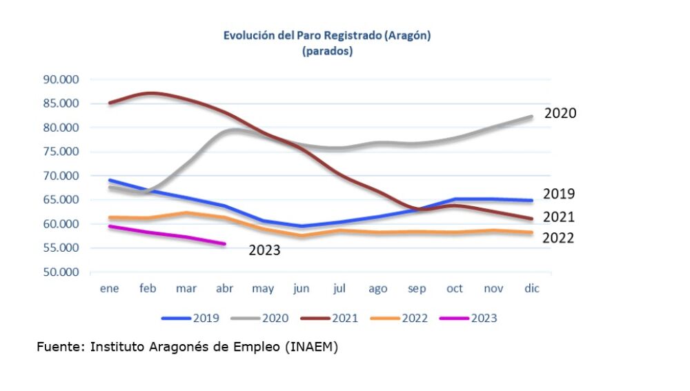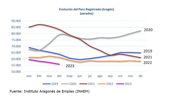 El paro registrado en Aragón ha descendido en 1.475 personas en abril respecto al mes anterior, de forma que ahora mismo hay 55.810 inscritos en las oficinas del INAEM, la cifra más baja desde septiembre de 2008. El desempleo ha disminuido en las tres provincias, en todos los sectores económicos y en todos los tramos de edad. El descenso es del 2,57% respecto al mes anterior y del 8,97% si lo comparamos con el paro de hace un año.