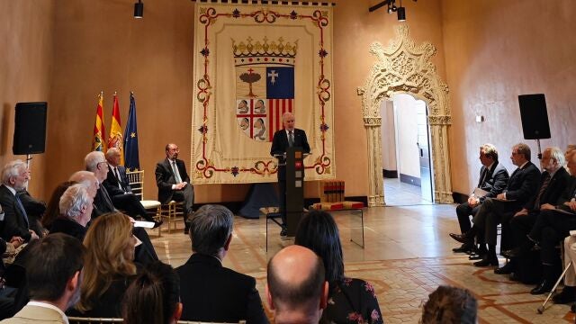 El presidente autonómico, Javier Lambán, ha obsequiado a los miembros de la RAE, entre los que se encontraban Soledad Puértolas, Aurora Egido y José Manuel Blecua, con una bandera aragonesa con letras del abecedario sijenense del siglo XIII y dos ensayos de Lázaro Carreter y Alvar.