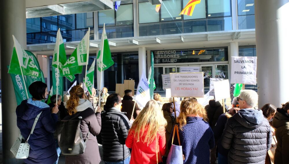 Los sindicatos de medicina y enfermería se han concentrado frente a la sede del Servicio Aragonés de Salud, para denunciar una aplicación “fraudulenta” de la jornada laboral de 35 horas y 40 minutos pactada en noviembre con el Gobierno autonómico.