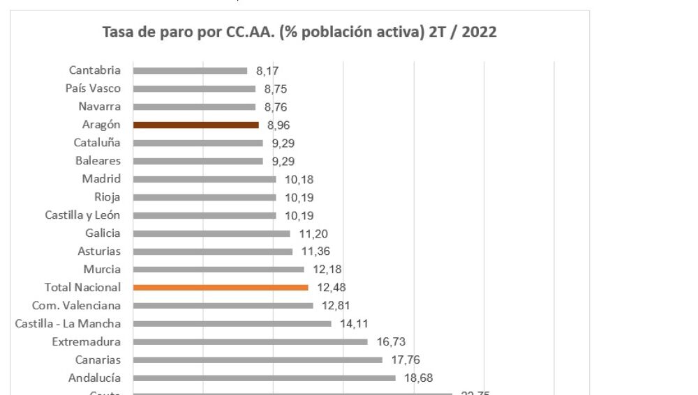La Encuesta de Población Activa del segundo trimestre de 2022 deja datos positivos en Aragón. En el último año el paro ha disminuido en 11.200 personas, un 16,27%, lo que sitúa el número total de desempleados en 57.800 y la tasa de desempleo en el 8,96%, la más baja desde 2008 e inferior a la media nacional en 3,52 puntos. Aragón es la cuarta Comunidad con menos paro.