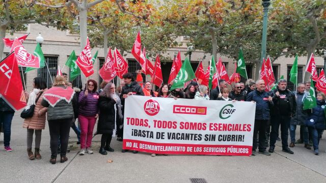 Hoy se han concentrado frente a la sede del Gobierno aragonés para denunciar que hay más de 2.000 puestos sin cubrir, lo que provoca una sobrecarga de trabajo al resto de la plantilla y el deterioro del servicio que prestan a los aragoneses. Esos tres sindicatos representan más del 80% de los empleados públicos de la administración general.
