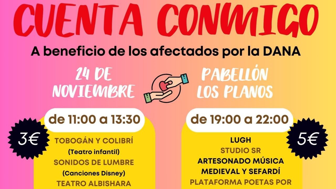 "Cuenta conmigo" se celebrará el próximo domingo 24 de noviembre en el Pabellón de Los Planos de la capital. La jornada arrancará a las once de la mañana con actividades dirigidas al público infantil y familiar. El programa incluye representaciones teatrales, talleres de manualidades e hinchables.