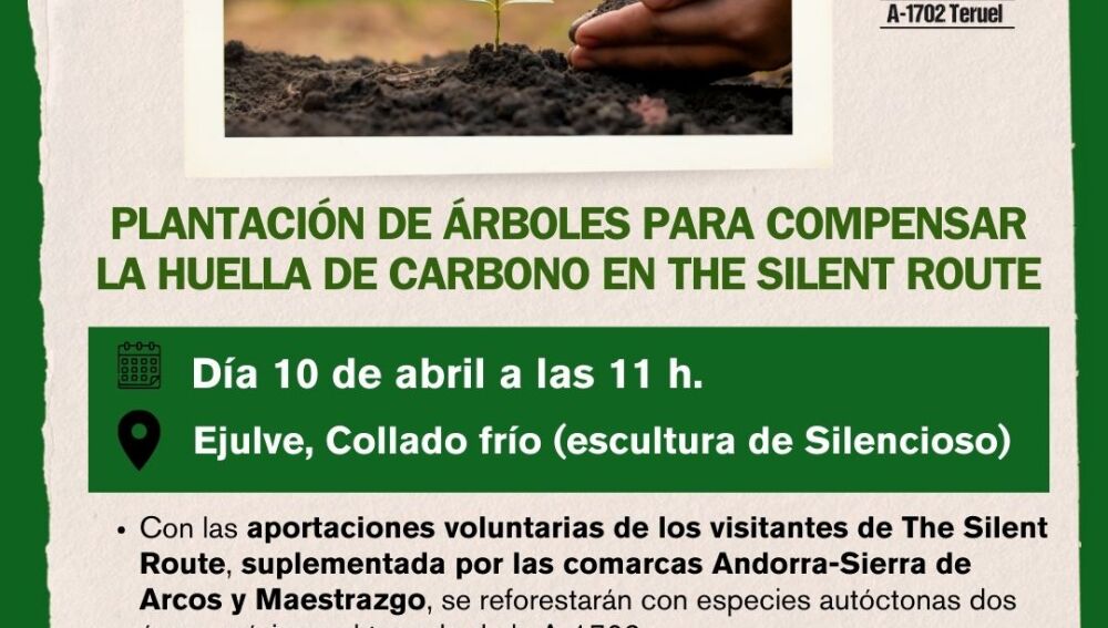 Para el miércoles ambas comarcas han programado una primera plantación en el término municipal de Ejulve, en una zona muy próxima al conocido mirador de “la cabra”. Se plantarán 100 árboles (encinas, pinos, enebros y robles) que serán el principio del futuro bosque de la Silent. El próximo año la plantación se realizará en la comarca del Maestrazgo. El objetivo de los organizadores es que cada año sean más los visitantes que compensen su huella de carbono y que junto con sus aportaciones y las de las comarcas se pueda realizar esta actividad cada primavera. Las plantaciones se irán alternado de comarca con la ilusión de que de aquí a unos años se hayan reforestado dos espacios aledaños a la Silent Route.