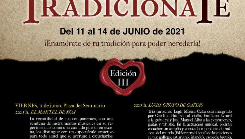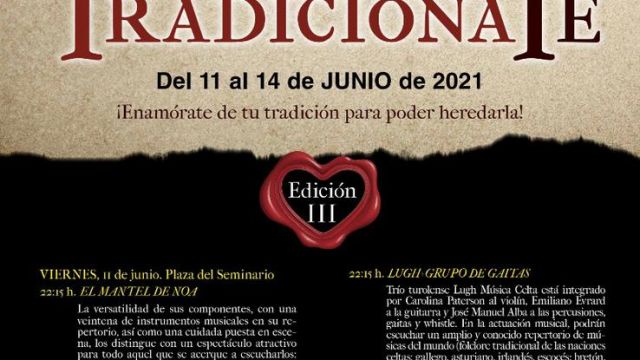 TradicionaTe 2021 comenzará con la actuación de “El Mantel de Noa”, dúo formado por Pilar Gonzalvo y Miguel Ángel Fraile que incluye una veintena de instrumentos musicales en su repertorio con una mirada distinta a la música antigua y del mundo. Será el viernes 11 de junio a las 22:15 horas. El sábado 12 la jornada comenzará a las 12:30 horas con Ana Alcaine, que invitará a los asistentes a realizar un viaje sonoro por la España de las culturas. Por la tarde, a las 18 horas, los más pequeños podrán disfrutar del desfile de la Comparsa de Gigantes y Giganticos de Teruel acompañada por el Grupo de Música Tradicional Santa Cecilia de la capital, desde la Plaza del Seminario a la Plaza de San Juan pasando por la Plaza del Torico. A las 22:15 horas horas llegará el turno del trío de música celta Lugh y el grupo de gaitas Gaitericos que interpretará un amplio y conocido repertorio de músicas del mundo.