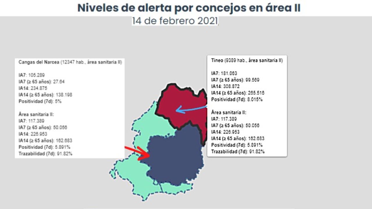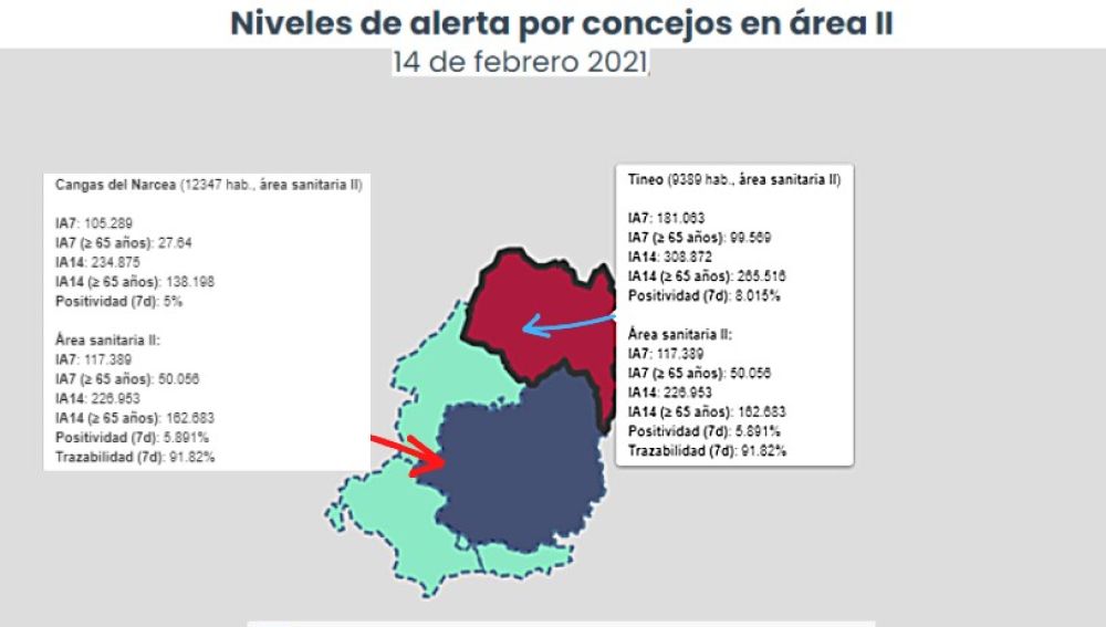 En Tineo se mantiene en una situación de sube/baja, sin medidas especiales, en la que al sumar dos nuevos casos han subido los valores en las IA7 e IA14, con 181 y 308 casos por cada 100.000 habitantes, ha vuelto a Nivel 4. Destacar también que se mantiene en 265 casos la IA14 +65a y desciende la Positividad al 8%.