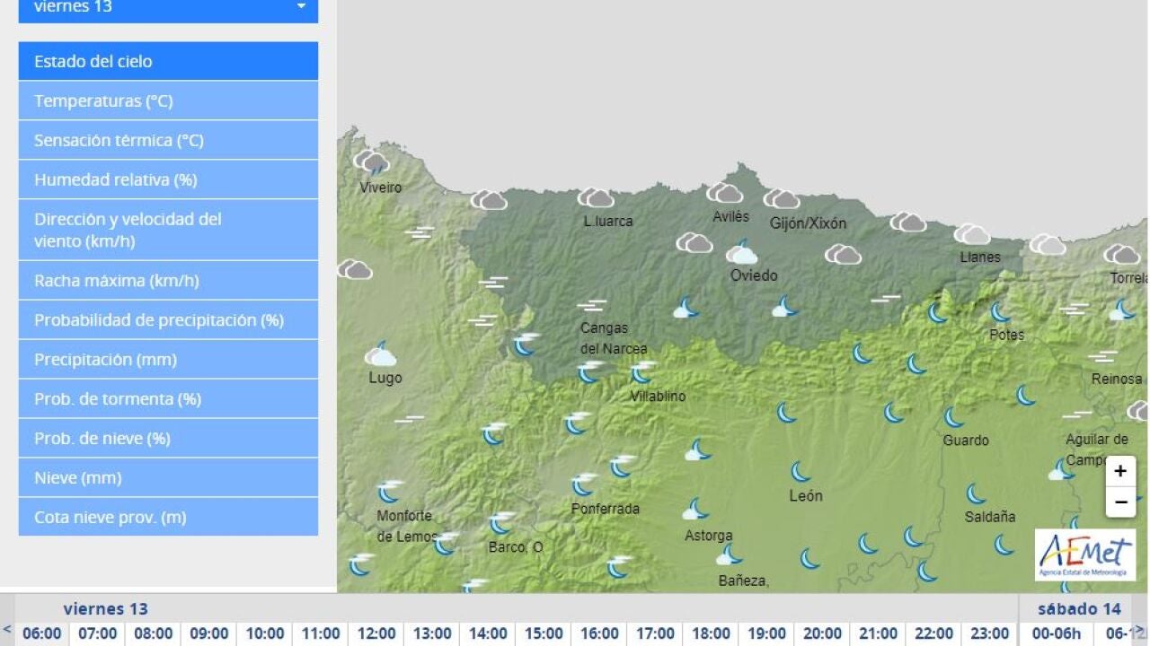 La Agencia Estatal de Meteorología prevé para hoy, viernes, día 13 de mayo de 2022 en Asturias cielo con intervalos nubosos con predominio de las nubes bajas y con nubosidad de evolución, chubascos dispersos y tormentas ocasionales en el interior, más probables, intensas y frecuentes en la Cordillera. Probables brumas y nieblas en el interior al principio y final del día.