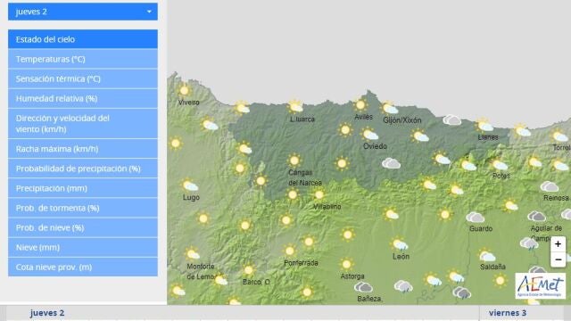 La Agencia Estatal de Meteorología prevé para hoy, jueves, día 2 de junio de 2022 en Asturias cielo poco nuboso al principio aumentando a nuboso durante el día. Chubascos que localmente pueden ser fuertes y con granizo, sobre todo en la mitad occidental. Brumas y probabilidad de bancos de niebla matinales en el interior suroeste.