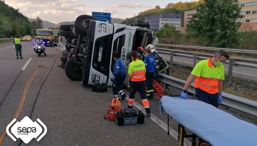El Centro de Coordinación de Emergencias del 112 Asturias ha recibido el aviso a las 20.32 horas. En la llamada señalaban que había un camión tráiler volcado en la citada vía de comunicación. Parecía que transportaba productos refrigerados. El conductor estaba dentro.