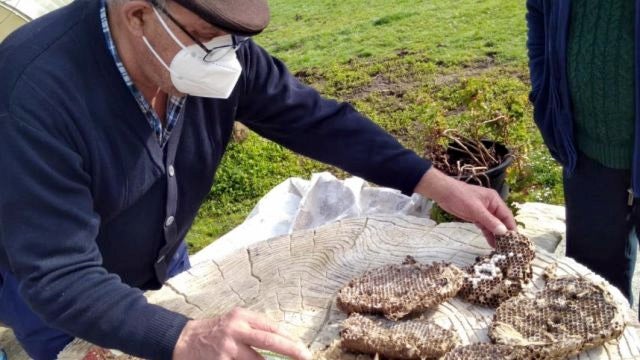 El nido zanganero encontrado en Riufríu fue diseccionado por uno de los voluntarios más activos, Emiliano del Dago, vecino de Los Carriles, cerca de Santa Marina de Parres; y el concejal Xuan Valladares; que inspeccionaron su interior en busca de datos para conocer algo más acerca de esta especie.