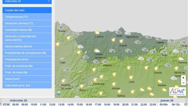 La Agencia Estatal de Meteorología prevé para hoy, miércoles, día 25 de mayo de 2022 en Asturias cielos nubosos, con nubosidad de evolución diurna en la Cordillera y brumas dispersas en el interior. Precipitaciones débiles que serán más probables y abundantes cuanto más al este y que irán remitiendo por la tarde. Temperaturas mínimas con pocos cambios. Temperaturas máximas en aumento, más acusado en el oeste. Vientos flojos de componente oeste en el litoral y norte en el interior.