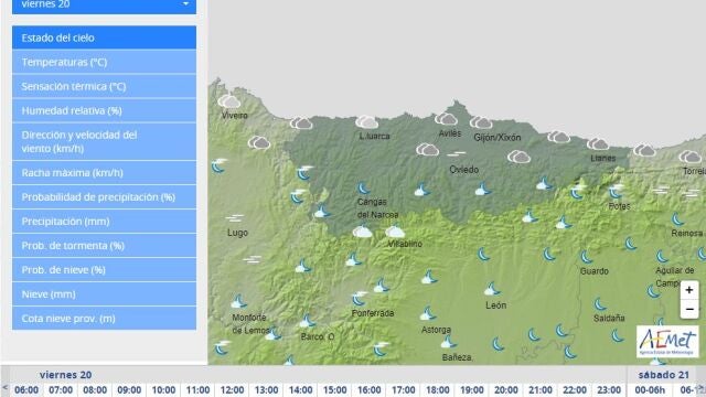 La Agencia Estatal de Meteorología prevé para hoy, viernes, día 20 de mayo de 2022 en Asturias cielo con predominio de cielos nubosos, principalmente de nubes bajas, asociadas a brumas y nieblas al principio y al final del día, y nubosidad de evolución diurna en horas centrales, que podría dar lugar a algún chubasco disperso o tormenta ocasional en la Cordillera. Probabilidad de calimas.