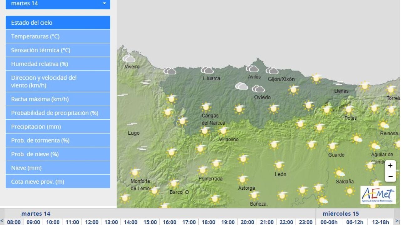 En cuanto a las temperaturas en las principales ciudades de la región, Oviedo registrará una mínima de 17 grados y una máxima de 28; en Gijón se oscilará entre la mínima de 17 y la máxima de 25, y Avilés entre una mínima de 16 y una máxima de 24.