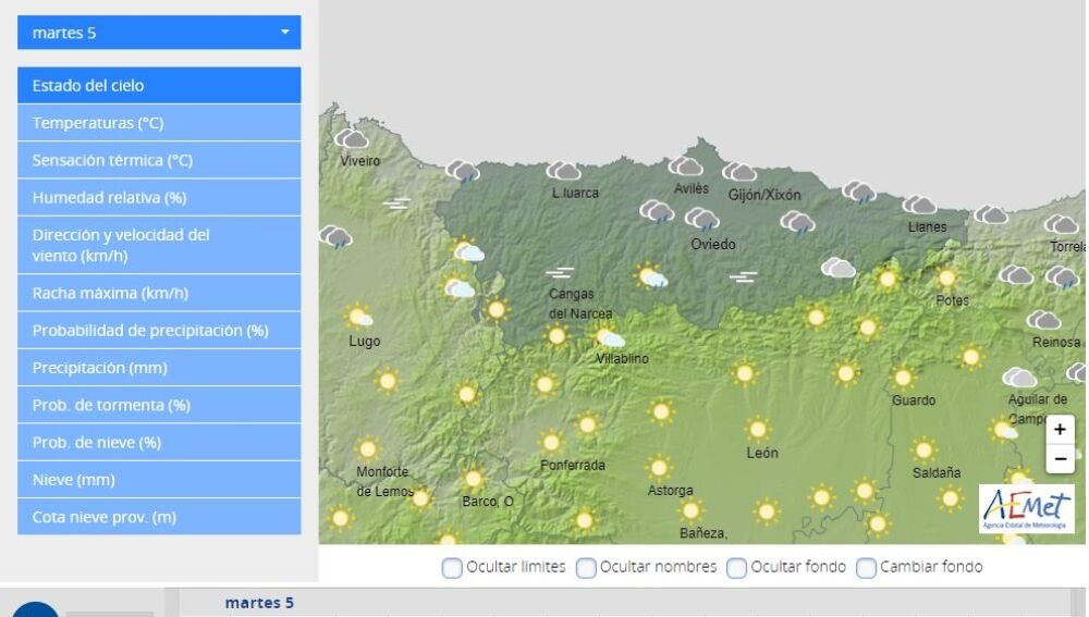 La Agencia Estatal de Meteorología prevé para hoy, martes, día 5 de julio de 2022 en Asturias cielo nuboso o cubierto de nubes bajas. Brumas y bancos de niebla en el interior. Lluvias débiles y dispersas y, por la tarde, chubascos que podrían ir acompañados de tormenta. Temperaturas sin cambios o en ligero ascenso. Viento del nordeste flojo, más intenso en la costa.