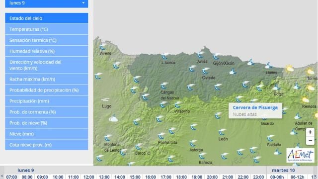 La Agencia Estatal de Meteorología prevé para hoy, lunes, día 9 de mayo de 2022 en Asturias intervalos de nubes altas con algunas nubes bajas en el litoral y extremo occidental donde son probables brumas y algún banco de niebla matinales.