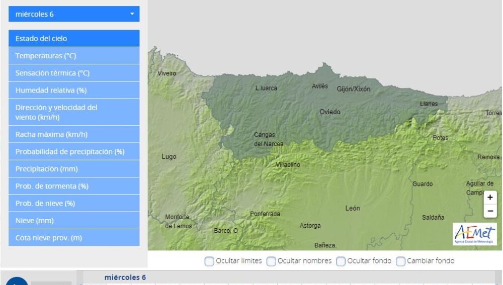 La Agencia Estatal de Meteorología prevé para hoy, miércoles, día 6 de julio de 2022 en Asturias cielo nuboso o cubierto disminuyendo a intervalos nubosos. Brumas y posibles nieblas al principio y al final del día en el interior. Lluvias débiles dispersas y algún chubasco o tormenta ocasional en la Cordillera, sin descartarse que pueda ser fuerte de madrugada en el extremo oriental.