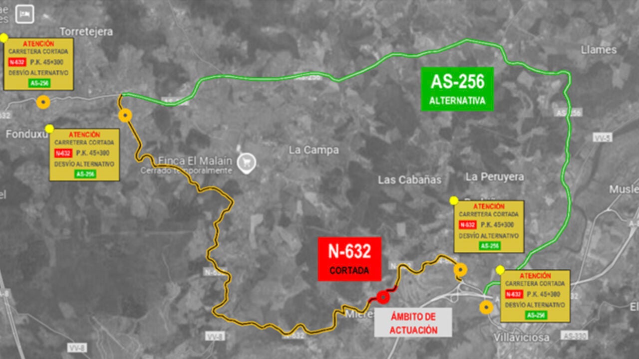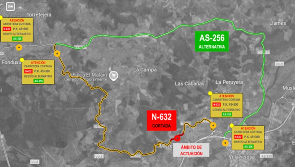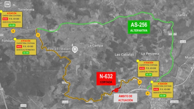 · Se desviará el tráfico entre los puntos kilométricos 43,400 y 53,400 de la N-632 por la carretera autonómica AS-256.