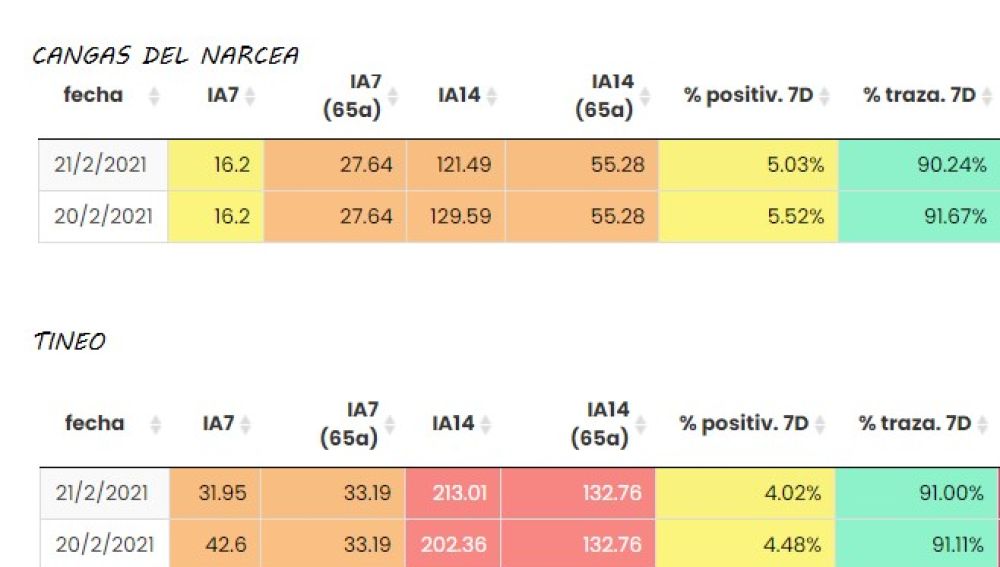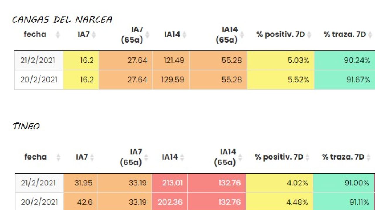 Otro dato es la afectación en las personas mayores de 65 años: 4 en Tineo y 2 en Cangas.