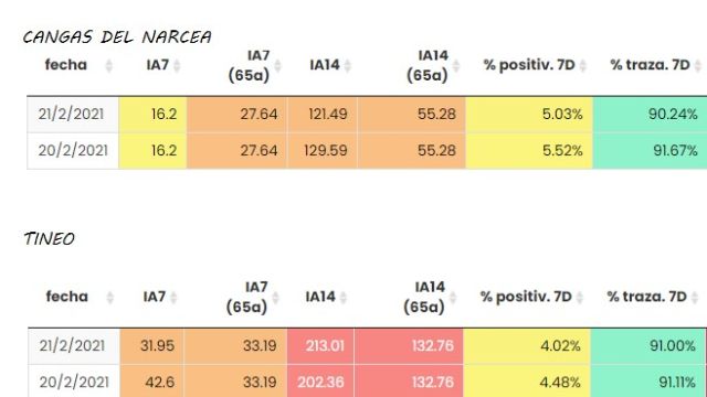 Son casos activos aquellos contabilizados en los últimos 14 días, (del 8 al 21 de febrero). De los 35 totales, 20 corresponden al concejo de Tineo (sumó el único positivo del domingo 21) y 15 a Cangas del Narcea.