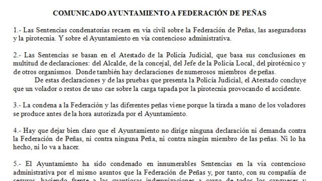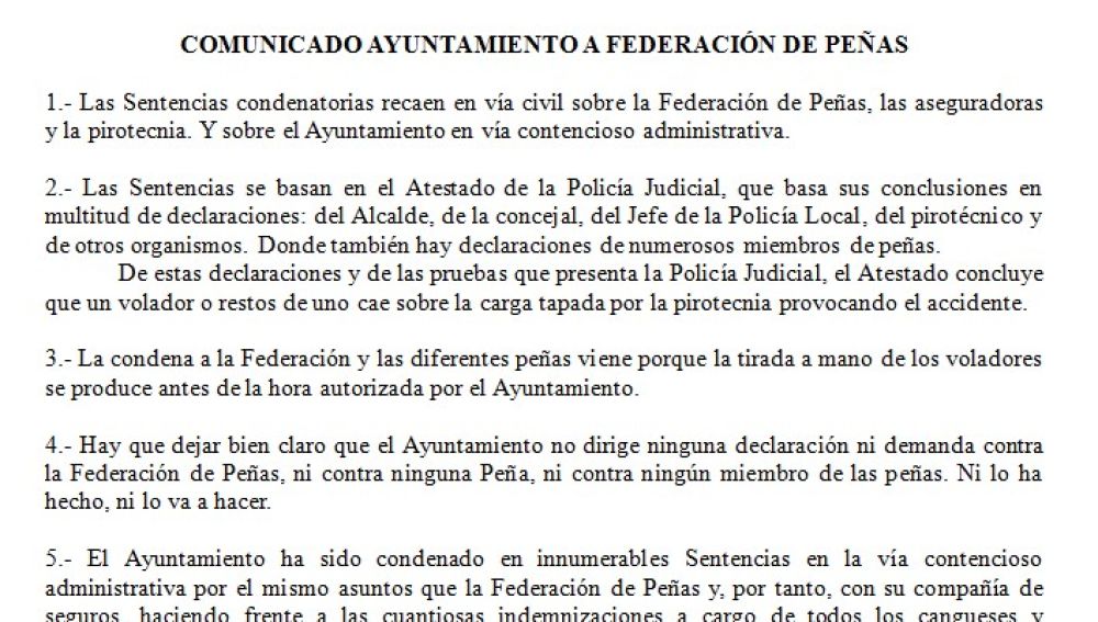 4.- Hay que dejar bien claro que el Ayuntamiento no dirige ninguna declaración ni demanda contra la Federación de Peñas, ni contra ninguna Peña, ni contra ningún miembro de las peñas. Ni lo ha hecho, ni lo va a hacer.