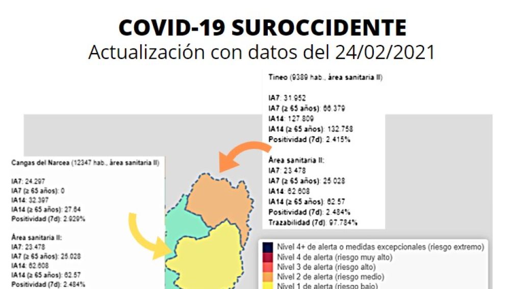 El último positivo se confirmó el miércoles 24 de febrero en Tineo, de esta forma son 12 los casos activos en este concejo, de ellos 3 en los últimos 7 días.