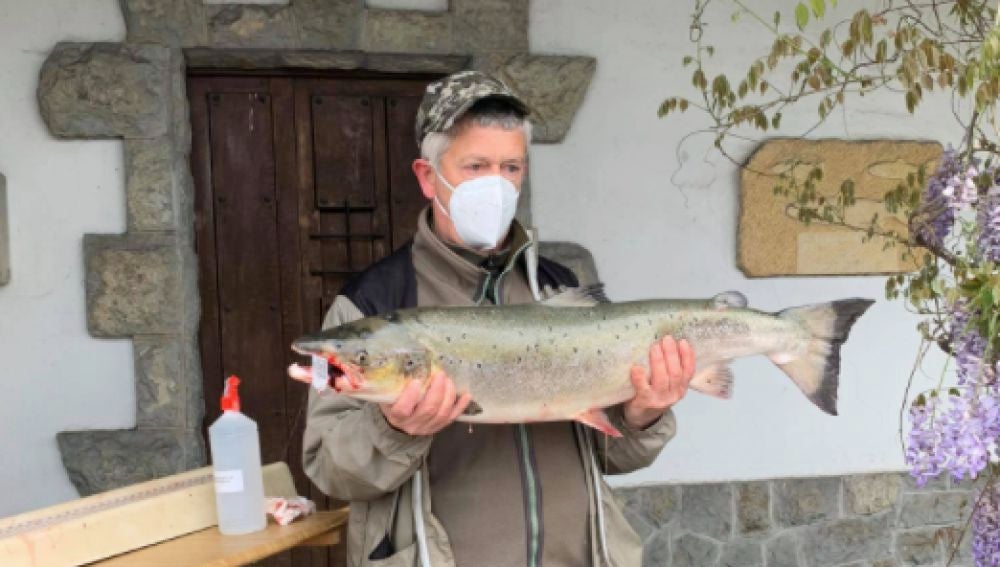 Recordemos que el Campanu de Asturias salía también esta mañana, gracias a la maña del quirosano Gonzalo Suárez. Lo echó a tierra en el entorno del coto de La Volta, en el río Eo, con un peso de algo más de cinco kilogramos.