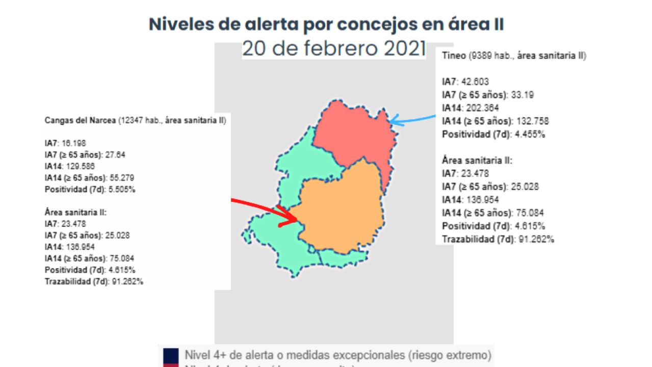 La IA14d en Tineo es de 202 casos por 100.000 habitantes. Nivel 3 de Alerta. Riesgo Alto.