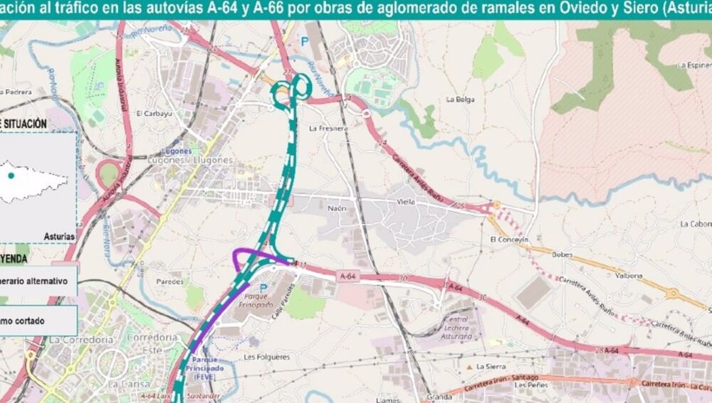 Se cortarán los accesos actuales en el viaducto del Espíritu Santo (salida 26) y la incorporación desde Oviedo, dirigiendo el tráfico sentido Gijón hasta una entrada habilitada al final de los trabajos (km 24,300) que permitirá recuperar la circulación por el trayecto habitual.