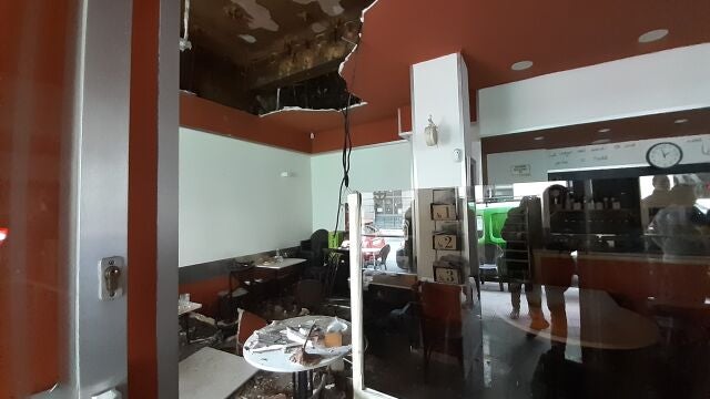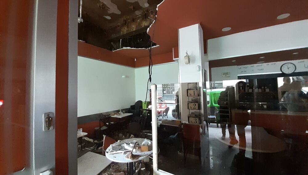 Una parte del falso techo de la cafetería Santa Fé de Oviedo se vino abajo este jueves a mediodía golpeando a algunos clientes. Según ha relatado el responsable del negocio, se trata de un joven que recibió el impacto en la cabeza y una chica que fue golpeada en la frente. Solo uno de ellos tuvo que ser trasladada a un centro sanitario. La caída parcial del techo generó notable expectación en la calle Ventura Rodríguez, ya muy cerca de la calle Independencia.