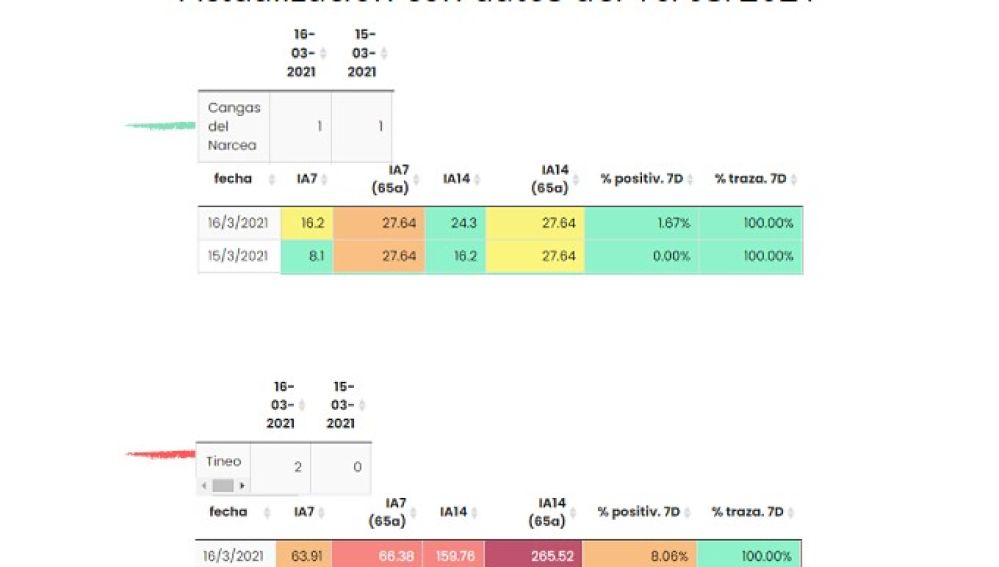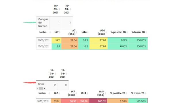 Así las cosas, a fecha 16 de marzo se contabilizan 3 casos activos en Cangas y 15 casos activos en Tineo (los que se suman en el periodo de 14 días).