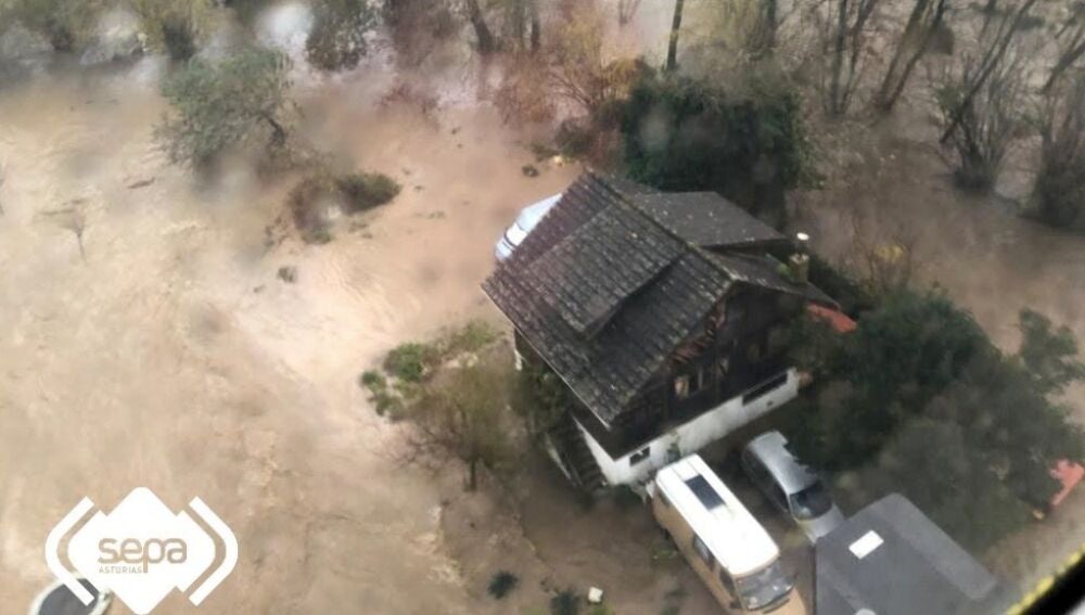 El Grupo de Rescate del SEPA, a bordo del helicóptero medicalizado, ha rescatado, en colaboración con Bomberos del SEPA del parque de Piloña, a tres personas de una vivienda que ha quedado rodeada por el agua en la recta de Lleu, en la fina de El Llerón, en el propio concejo piloñes. En concreto se ha evacuado a tres personas, un matrimonio y su hijo de 7 años y a un perro. Para llevar a cabo la intervención se realizaron cinco ciclos de grúa, de entre 35 y 40 metros, con el helicóptero de bomberos.